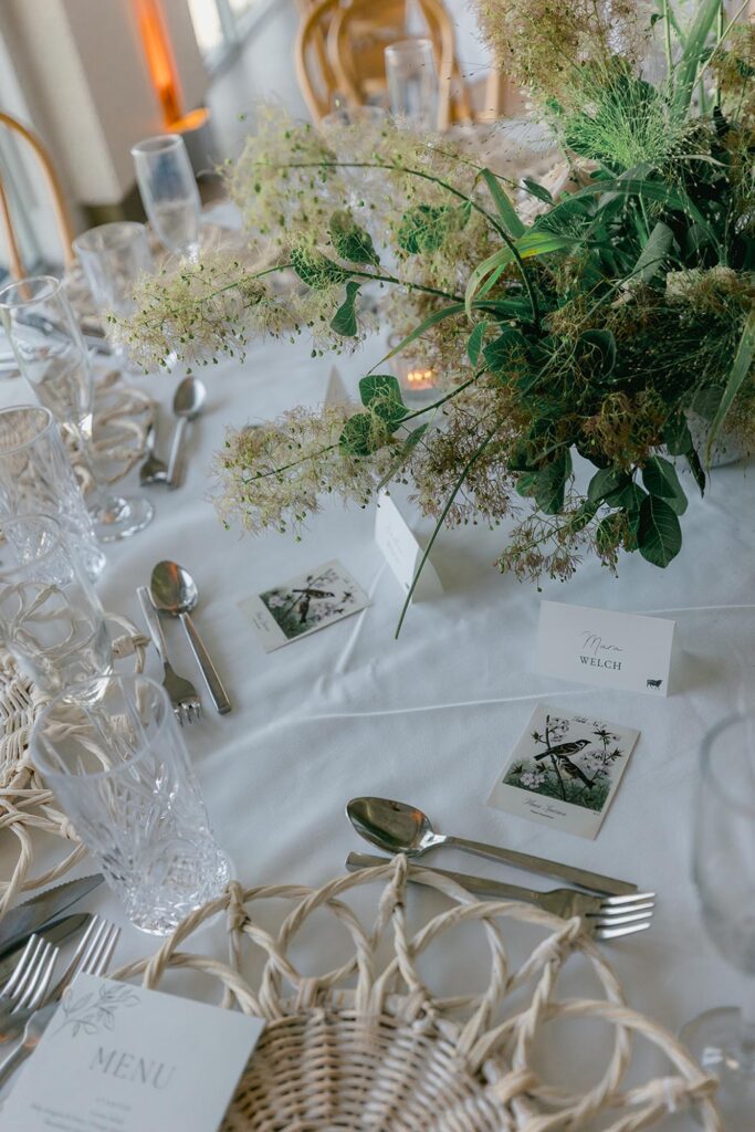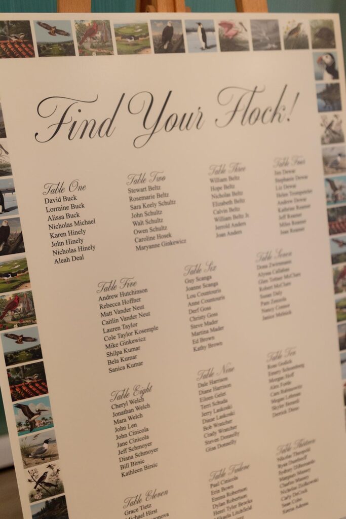 Amy and Jack love birds, so they used that as a personal touch throughout the reception. Each table was named after a different type of bird, and the seating cards matched. It was a fun detail that stood out to guests and tied the whole space together.